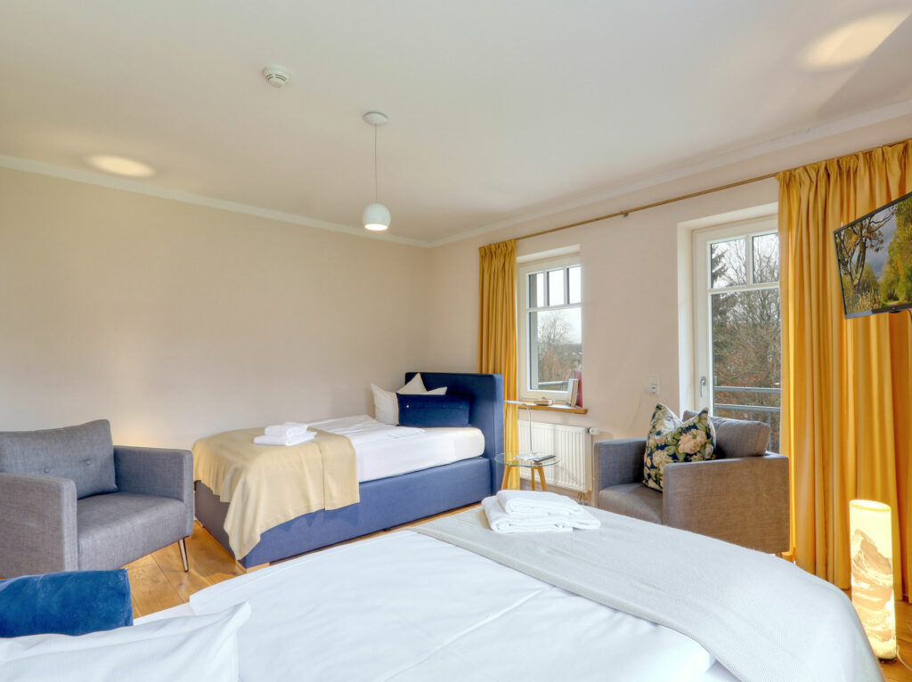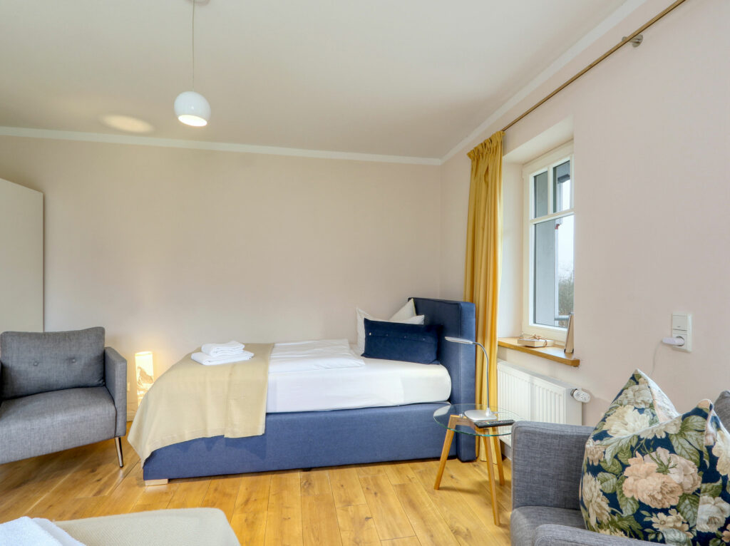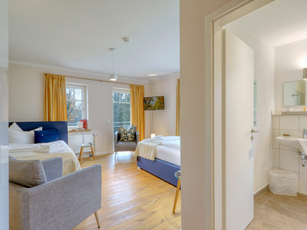 Unsere circa 20 m² großen und komfortablen Doppelzimmer verfügen über ein komfortables Doppelbett oder zwei große Einzelbetten. Für maximal 2 Personen bieten sie den perfekten Rückzugsort für Entspannung und Erholung durch eine ruhige Atmosphäre. Die hochwertige Ausstattung wird durch den Flachbild-TV, Echtholz Parkett und ein großzügiges Bad abgerundet. Es gibt 4 Doppelzimmer im 1. Stock, 1 Doppelzimmer im EG. Die Betten lassen sich wahlweise als Doppelbett oder zwei Einzelbetten (1,20 x 2,00 m) nutzen.