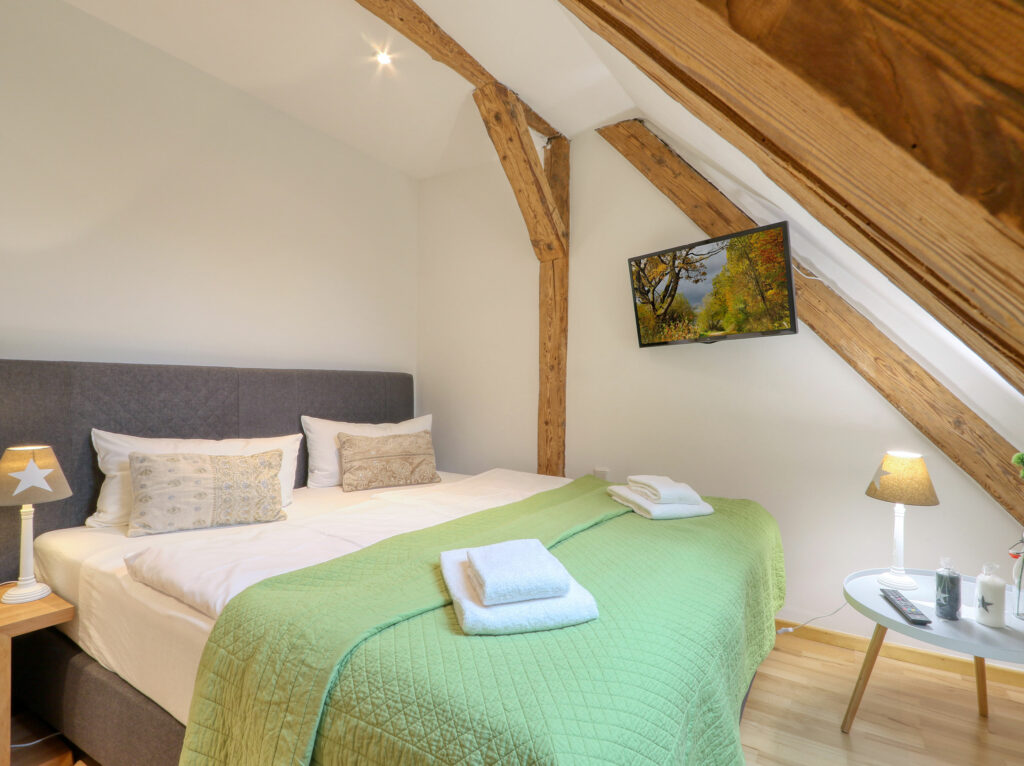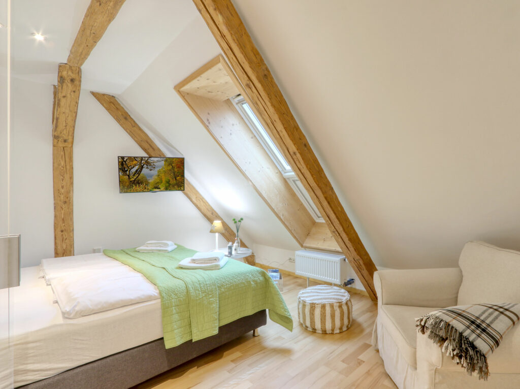 Unsere circa 20 m² großen und komfortablen Doppelzimmer verfügen über ein komfortables Doppelbett oder zwei große Einzelbetten. Für maximal 2 Personen bieten sie den perfekten Rückzugsort für Entspannung und Erholung durch eine ruhige und hochwertige Atmosphäre. Die hochwertige Ausstattung wird durch den Flachbild-TV, Echtholz Parkett und ein großzügiges Bad abgerundet. Es gibt 4 Doppelzimmer im 1. Stock, 1 Doppelzimmer im EG. Die Betten lassen sich wahlweise als Doppelbett oder zwei Einzelbetten (1,20 x 2,00 m) nutzen.