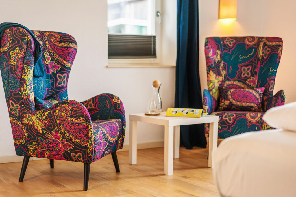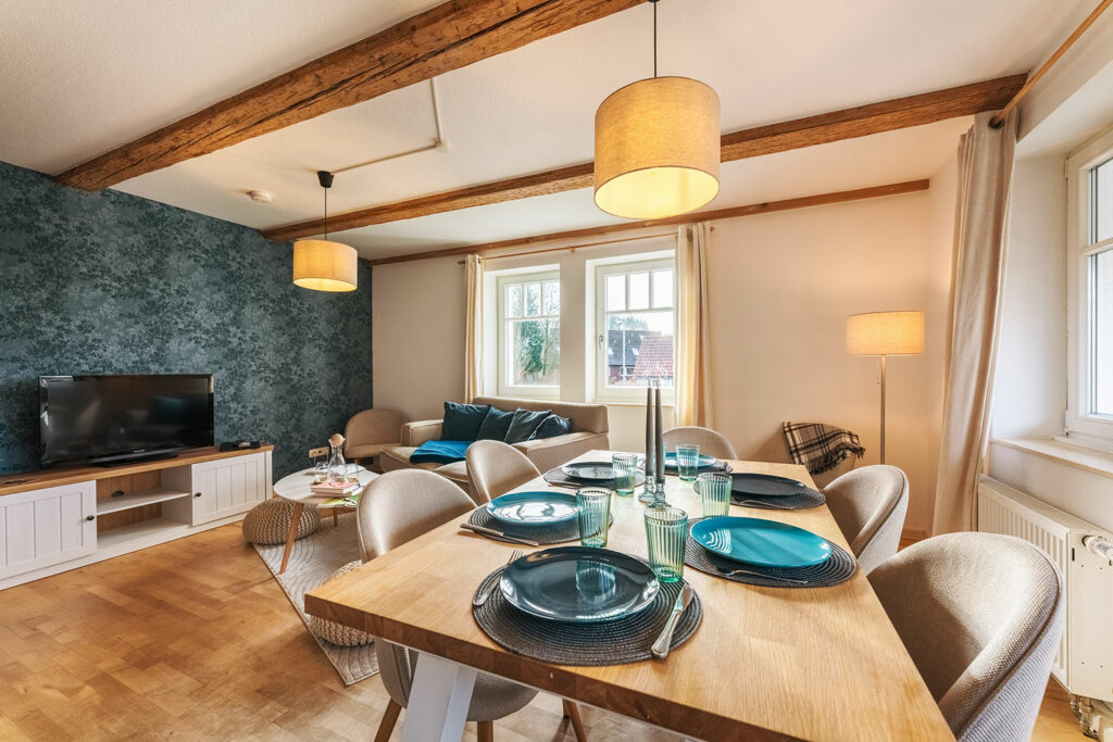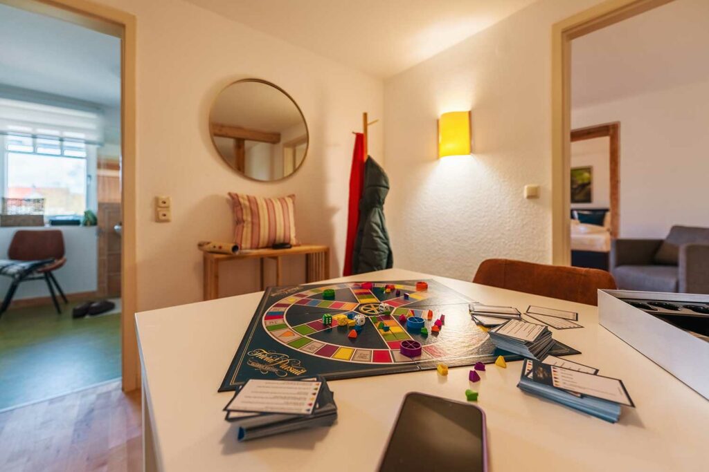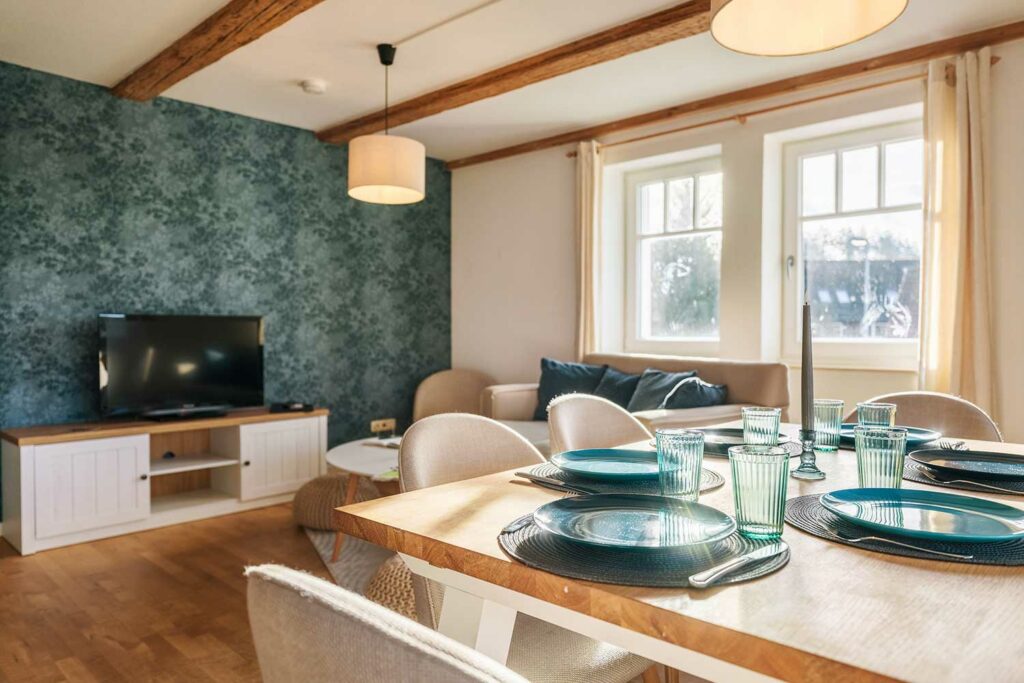 Im hellen und großzügigen Aufenthaltsraum befindet sich die voll ausgestattete Küche mit Kühlschrank, Backofen, Herd, Spülmaschine, Kaffeemaschine und Wasserkocher, sowie Esstisch für 6 Personen, ein TV sowie kostenfreies Wlan. Im Bad mit Dusche stehen Ihnen WC, Föhn und Handtuchwärmer zur Verfügung. Im Erdgeschoss erwarten Dich neben dem Frühstückssaal mit Blick auf den großen Garten auch ein gemütliches Kaminzimmer, das allen Gästen offensteht. Auf Wunsch kann ein Zustellbett (Schlafsofa) hinzugebucht werden.