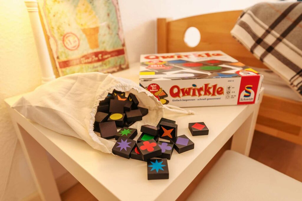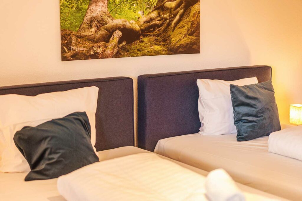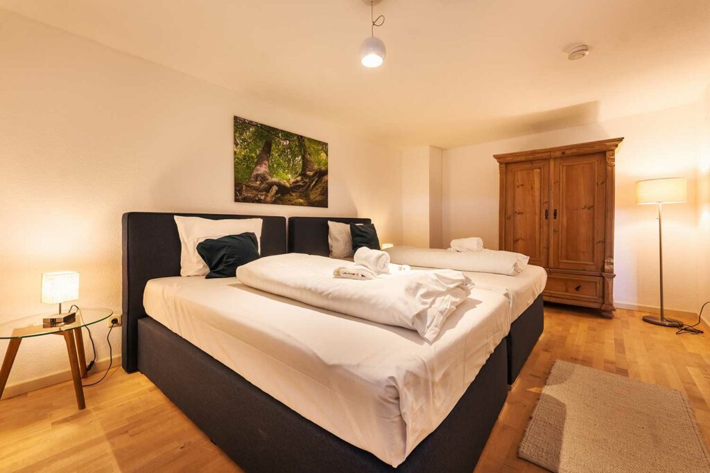 Diese circa 110 m² große Ferienapartment im 1. Stock bietet 3 Schlafzimmer, davon eins als Kinderzimmer mit zwei Einzelbetten (0,90 x 2,00 m) und eine kleine Spielecke vor dem Elternschlafzimmer an. In den anderen zwei Schlafzimmern befindet sich jeweils ein Doppelbett mit zwei separaten Matratzen (je 1,20 x 2,00 m), auf Wunsch auch als 2 Einzelbetten stellbar.