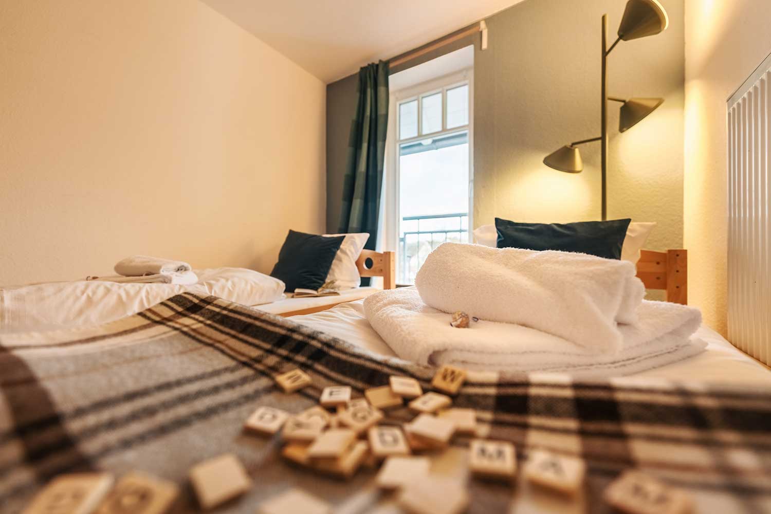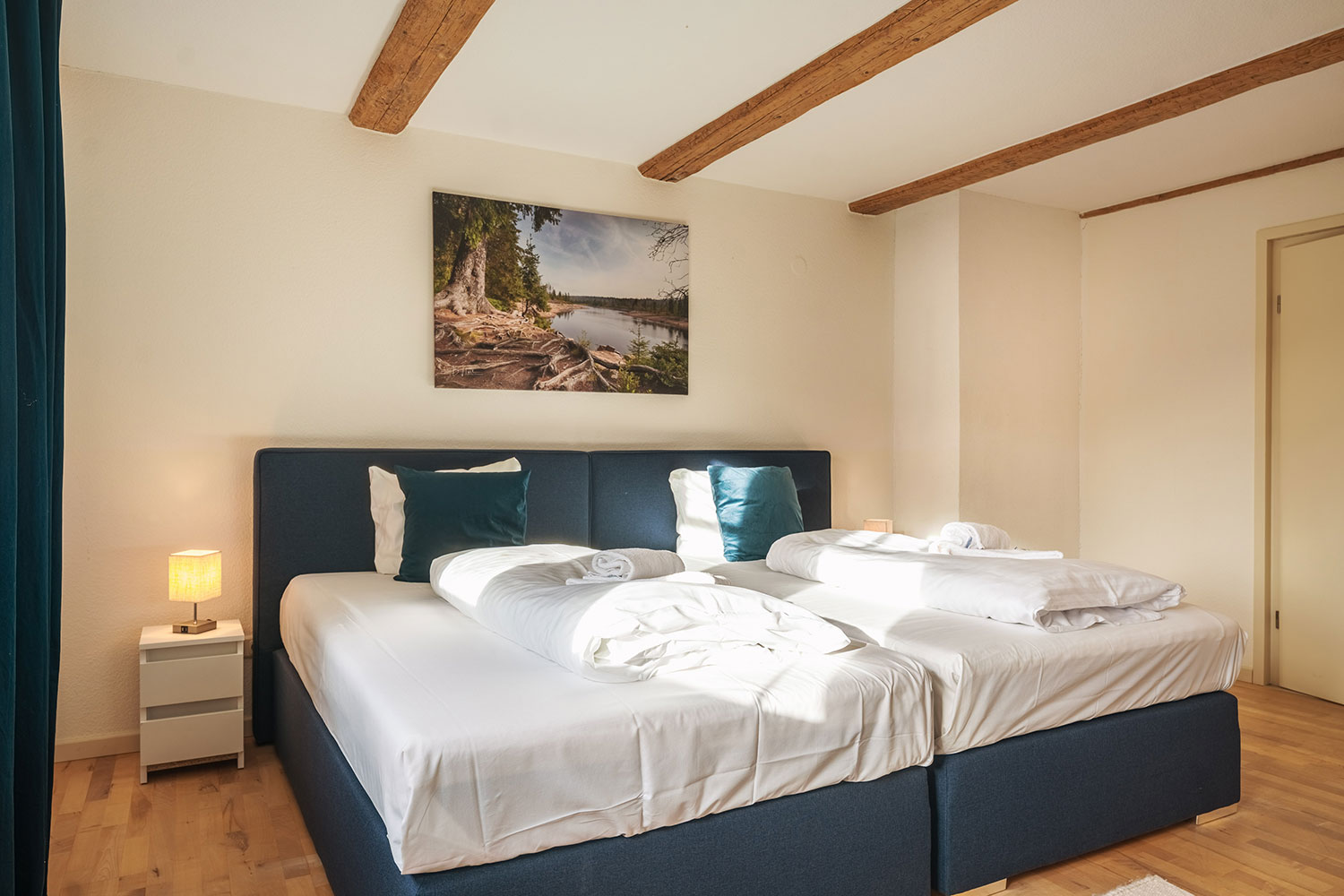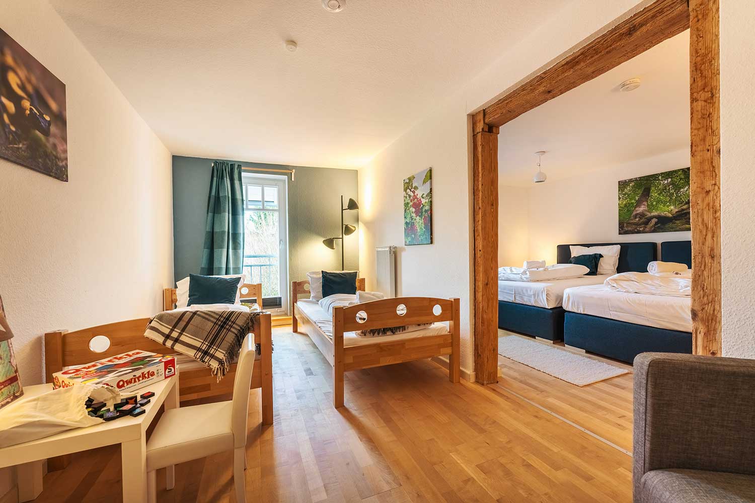 Diese circa 110 m² große Ferienapartment im 1. Stock bietet 3 Schlafzimmer, davon eins als Kinderzimmer mit zwei Einzelbetten (0,90 x 2,00 m) und eine kleine Spielecke vor dem Elternschlafzimmer an. In den anderen zwei Schlafzimmern befindet sich jeweils ein Doppelbett mit zwei separaten Matratzen (je 1,20 x 2,00 m), auf Wunsch auch als 2 Einzelbetten stellbar.