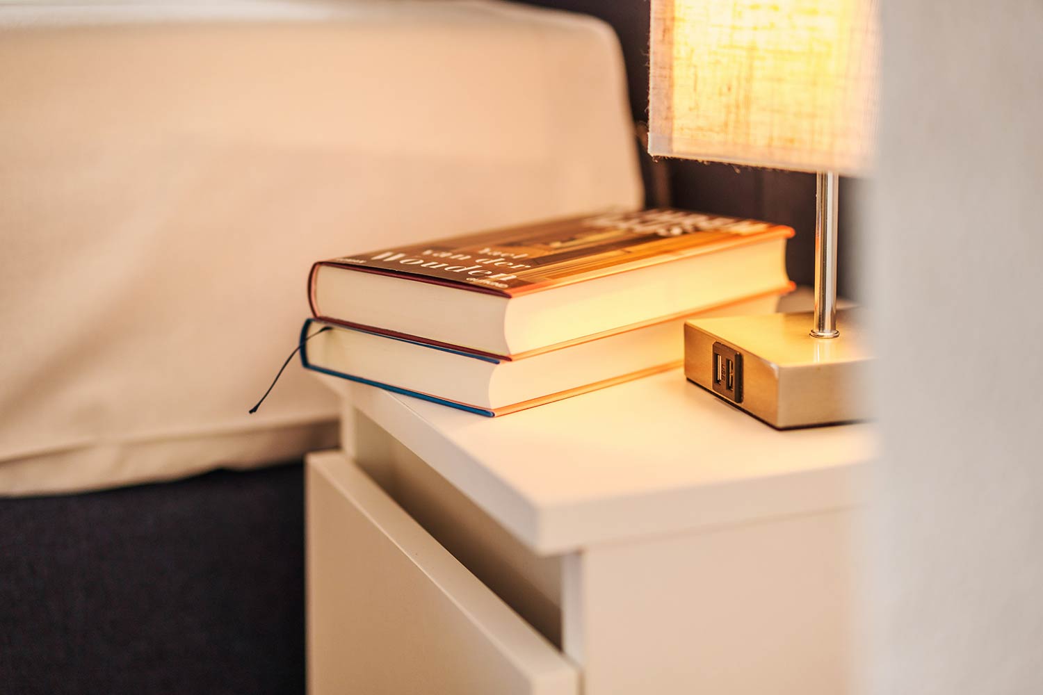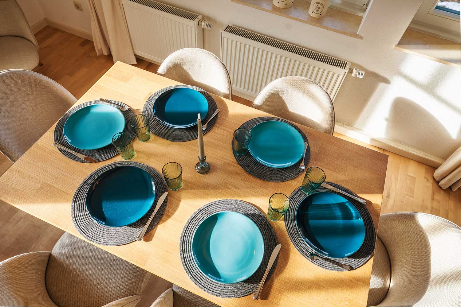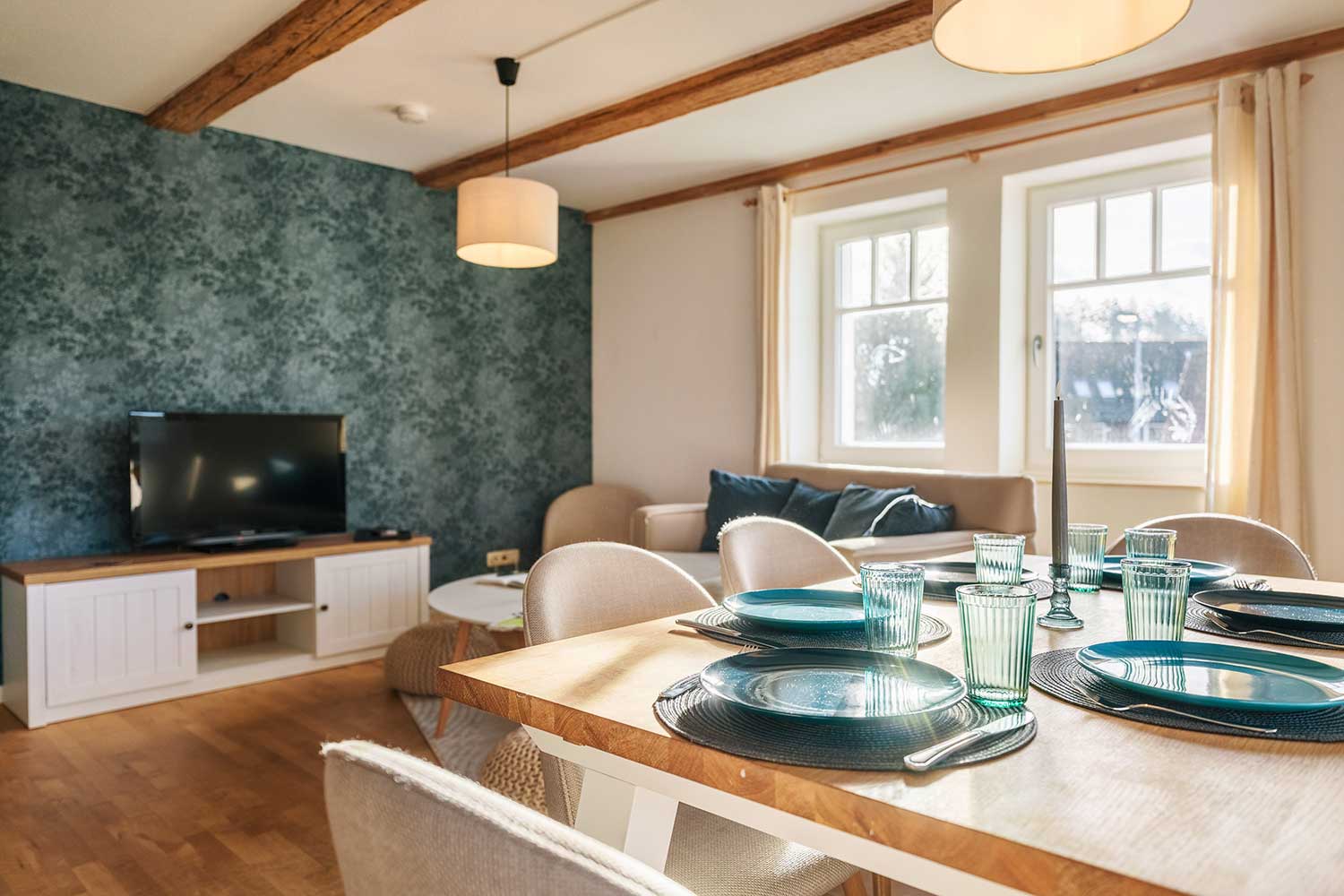 Diese circa 110 m² große Ferienapartment im 1. Stock bietet 3 Schlafzimmer, davon eins als Kinderzimmer mit zwei Einzelbetten (0,90 x 2,00 m) und eine kleine Spielecke vor dem Elternschlafzimmer an. In den anderen zwei Schlafzimmern befindet sich jeweils ein Doppelbett mit zwei separaten Matratzen (je 1,20 x 2,00 m), auf Wunsch auch als 2 Einzelbetten stellbar.