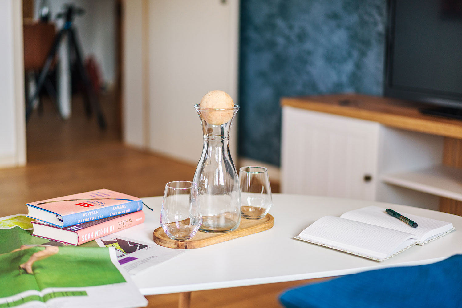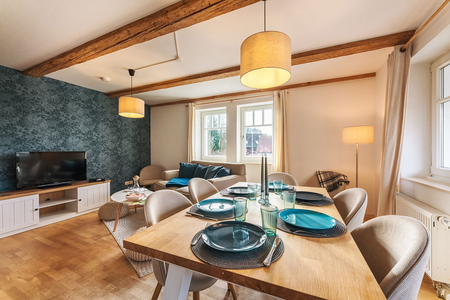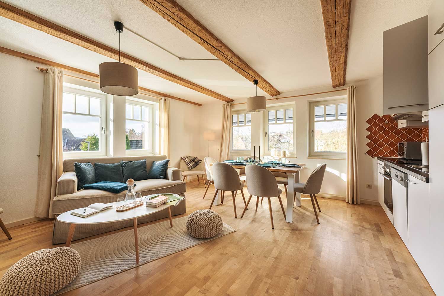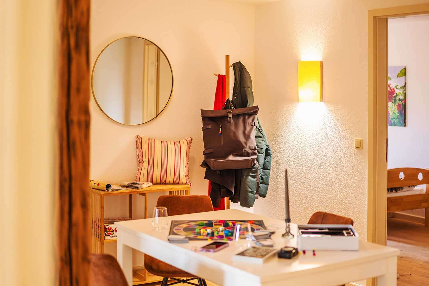Im hellen und großzügigen Aufenthaltsraum befindet sich die voll ausgestattete Küche mit Kühlschrank, Backofen, Herd, Spülmaschine, Kaffeemaschine und Wasserkocher, sowie Esstisch für 6 Personen, ein TV sowie kostenfreies Wlan. Im Bad mit Dusche stehen Ihnen WC, Föhn und Handtuchwärmer zur Verfügung. Im Erdgeschoss erwarten Dich neben dem Frühstückssaal mit Blick auf den großen Garten auch ein gemütliches Kaminzimmer, das allen Gästen offensteht. Auf Wunsch kann ein Zustellbett (Schlafsofa) hinzugebucht werden.